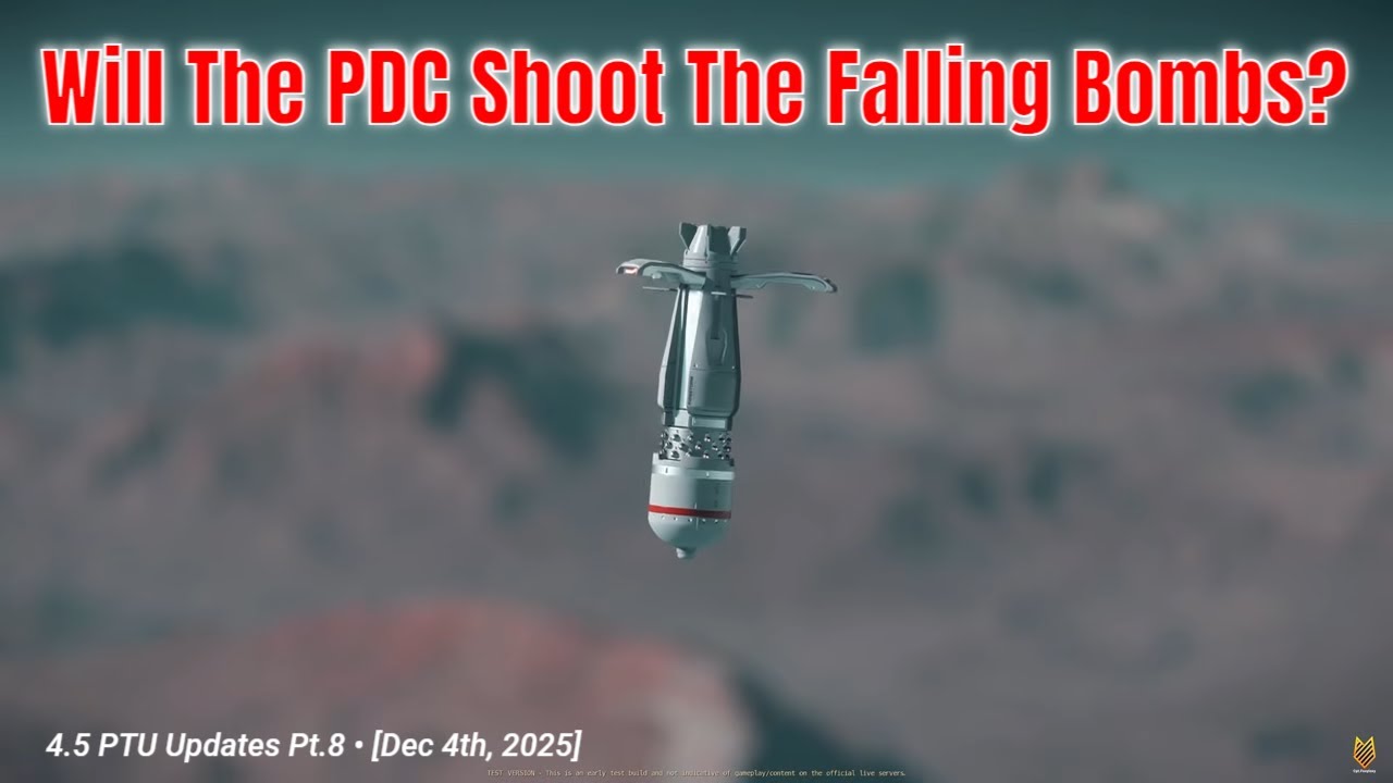 In the 4.5 PTU patch of Star Citizen, Point Defense Cannons (PDCs) now engage falling bombs regardless of ship hostility, but their tracking and accuracy remain poor, often allowing bombs to hit and damage ships. While the feature works in principle, server issues and ineffective targeting currently limit the PDCs’ ability to reliably destroy incoming bombs.