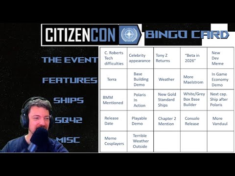 In the video, the host presents a bingo card filled with predictions for CitizenCon 2025, discussing potential highlights such as technical difficulties, celebrity appearances, and significant game updates related to Terra and ship reveals. They encourage viewers to join a live stream during the event and participate in a giveaway while sharing lighter predictions about the atmosphere and attendance at the convention.