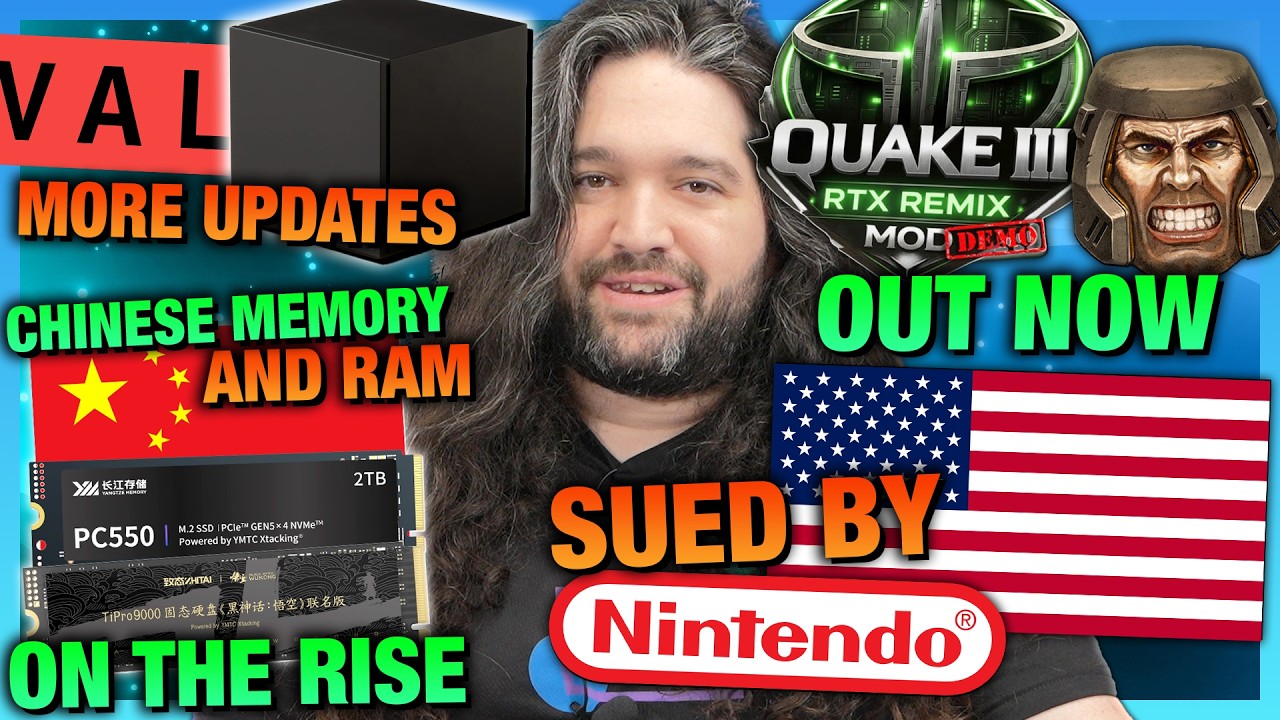 This week’s hardware news covers Valve’s Steam Machine release still planned for 2026 despite supply challenges, Nintendo’s lawsuit against US tariffs, Microsoft’s teased new Xbox console under AI-focused leadership, and rising Chinese memory and storage manufacturers CXMT and YMTC gaining market presence. Additionally, the video highlights creative modding projects like Quake 3 Remix while condemning abusive YouTube copyright strikes that threaten fair use and community criticism.