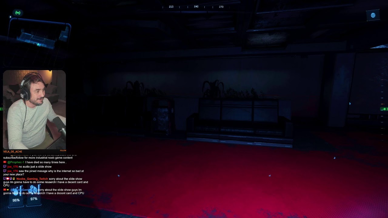 The video features a live stream of players engaging in the Star Citizen game, specifically tackling the Onyx Site-B Hyperion mission. The streamer begins by discussing technical difficulties with their internet connection and streaming quality, noting issues with dropped frames and network instability due to new broadband setup in a recently moved-into home. Despite these challenges, the streamer interacts with viewers and fellow players, sharing experiences about PC hardware upgrades, gaming setups, and the complexities of streaming Star Citizen. The conversation also covers various gaming peripherals and the advantages of using Macs for streaming purposes.
