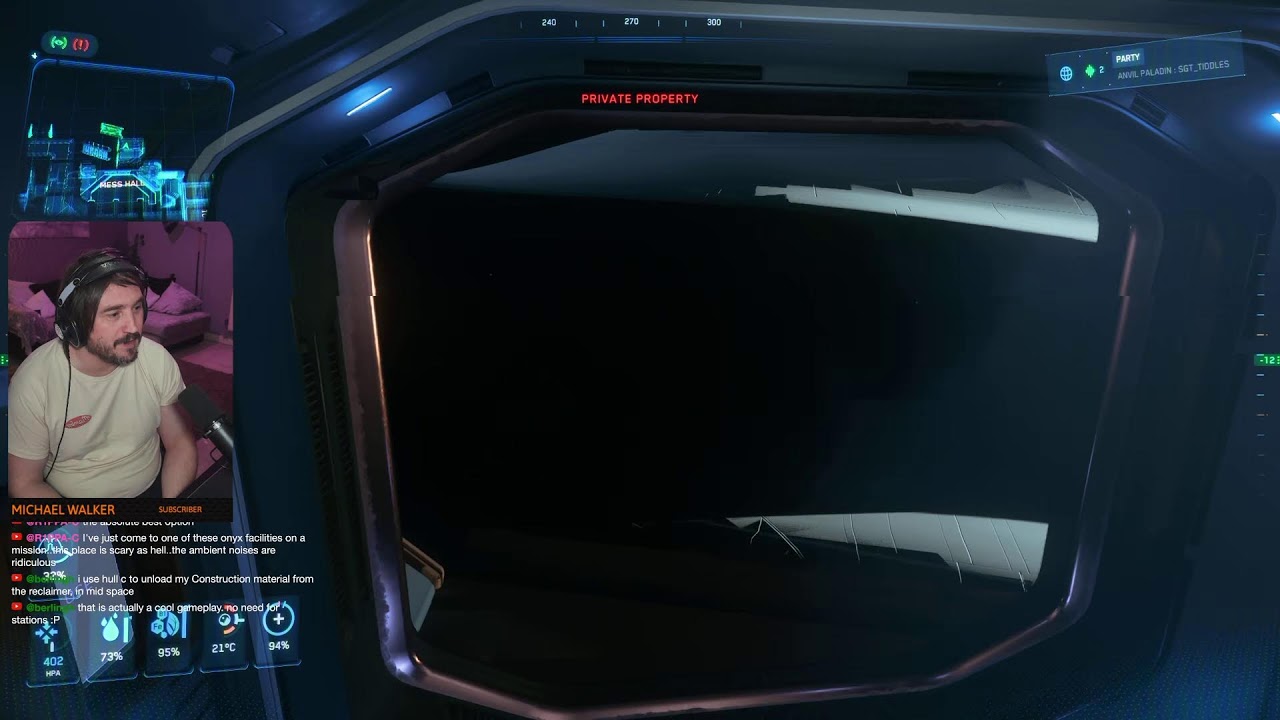 The session also features moments of technical troubleshooting and game mechanics discussion. Players grapple with issues like elevator malfunctions, ship retrieval problems, and inventory glitches, reflecting the evolving and sometimes unstable nature of Star Citizen’s development. They share tips on managing inventory, using vehicle retrieval systems, and navigating the game’s complex UI. Additionally, there are light-hearted exchanges about streaming setups, VR hardware considerations, and personal anecdotes, adding a social and informal layer to the gameplay experience.
